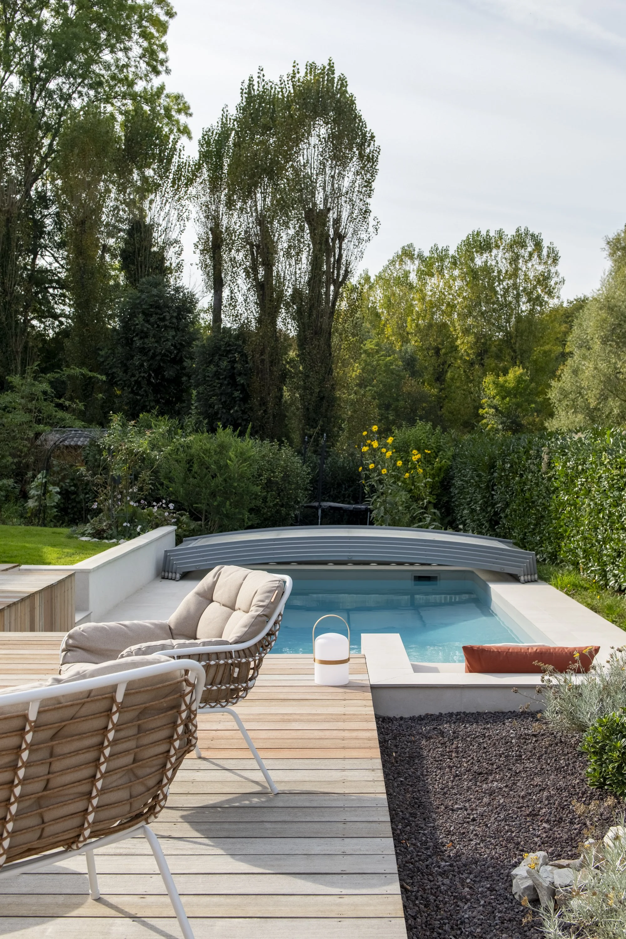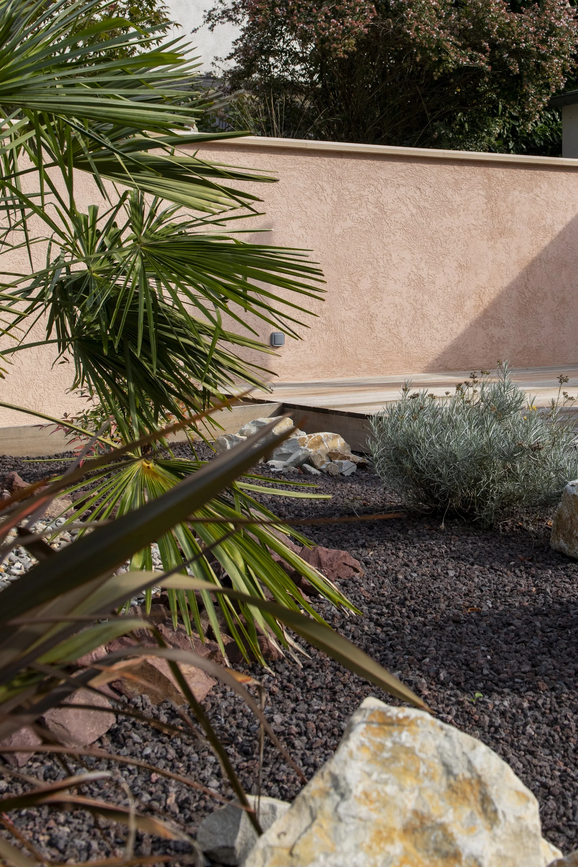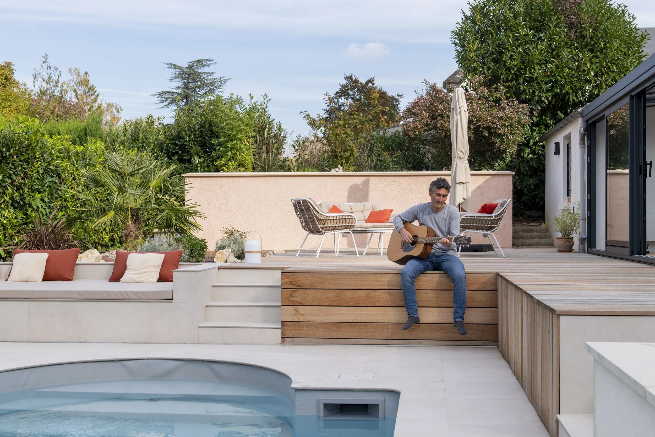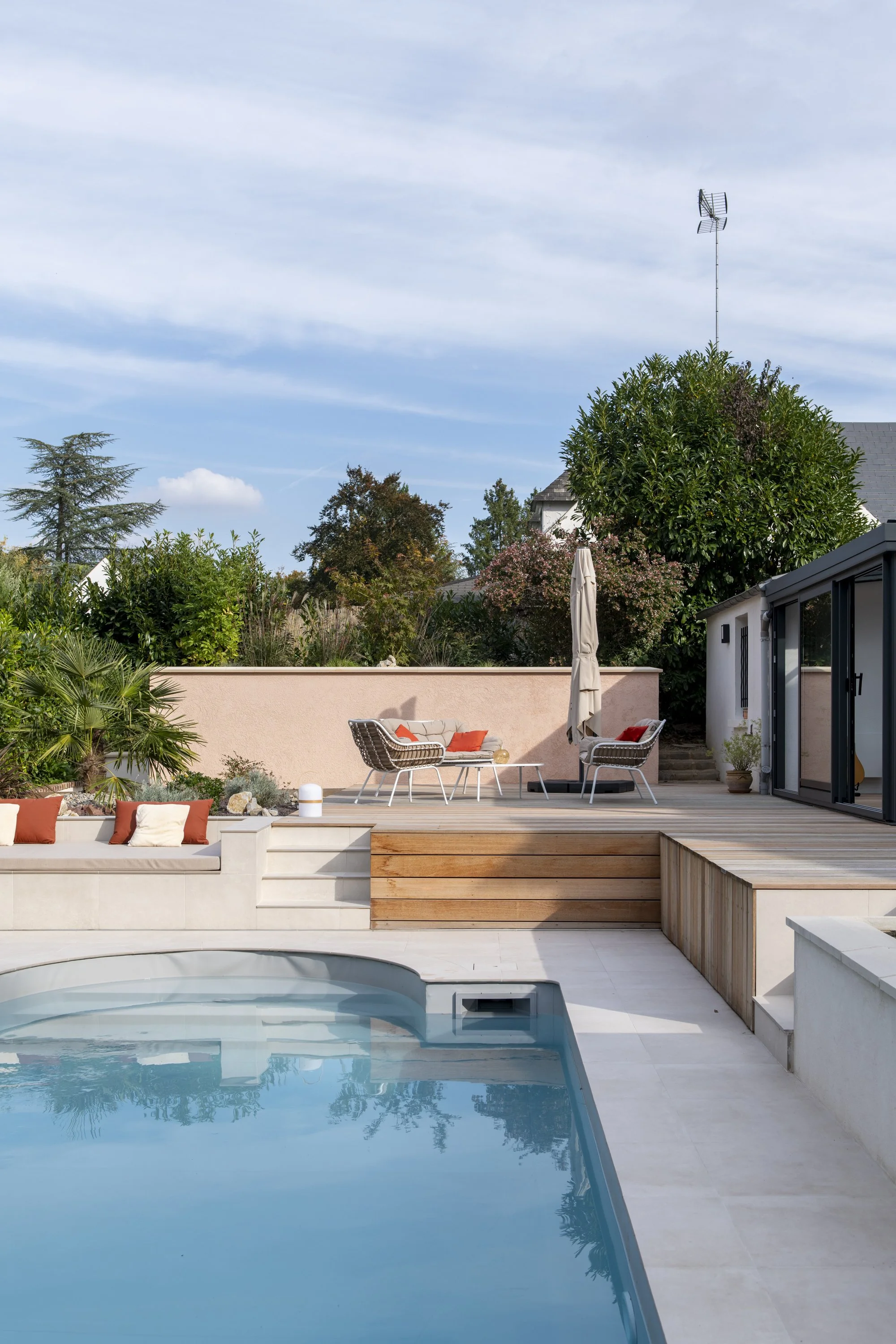 Ce projet de réaménagement paysager concerne le jardin d’une maison avec piscine existante. L’analyse du site a mis en évidence deux problématiques majeures : d’une part, la géométrie des terrasses extérieures ne répondait pas aux usages attendus; d’autre part, les revêtements de sol n’étaient pas adaptés à la nature argileuse du terrain, sujette aux mouvements de retrait-gonflement. Le projet apporte une simplification de l’organisation du jardin en supprimant les courbes et les gradins inadaptés de l’aménagement initial. Il s’appuie désormais sur deux niveaux de terrasses, répondant aux besoins fonctionnels des habitants : un espace repas relié à la cuisine, un espace lounge préservé des regards et une zone solarium attenante à la piscine. La plage de piscine, en contrebas, intègre une méridienne. La véranda existante, peu performante, est entièrement rénovée pour améliorer son isolation et sa luminosité. L’ensemble du réaménagement permet de fluidifier les circulations et d’optimiser les usages extérieurs. La gestion de l’imperméabilisation du sol constitue un autre axe important du projet. Les surfaces végétalisées sont augmentées et repensées pour favoriser l’infiltration des eaux et renforcer l’intimité vis-à-vis du voisinage. Les matériaux ont été choisis en cohérence avec ces objectifs : platelage bois pour les zones de vie principales, grès cérame teinte claire pour la plage de de la piscine, gravier mignonette pour les cheminements secondaires et enduit à la chaux en parements des murets.