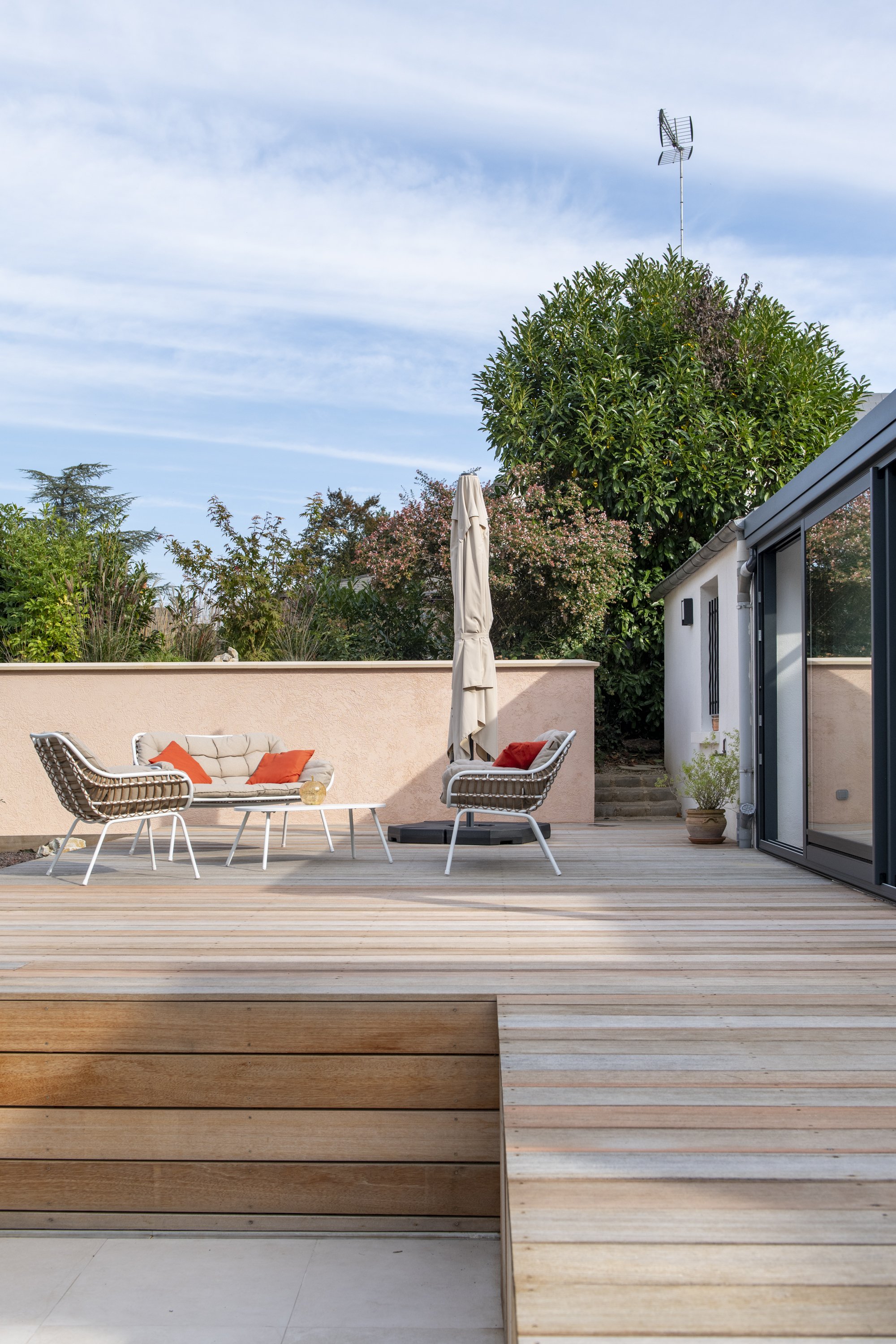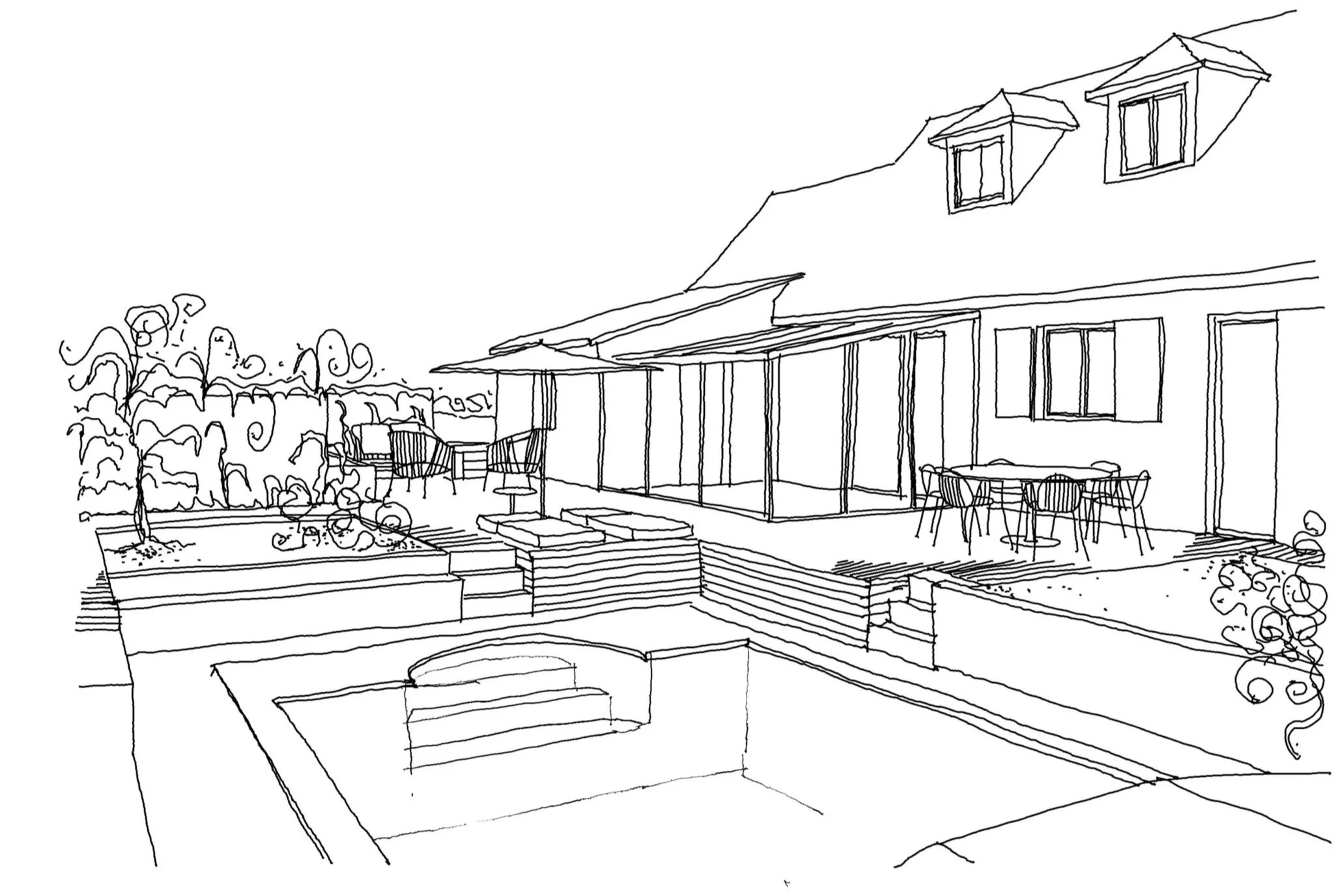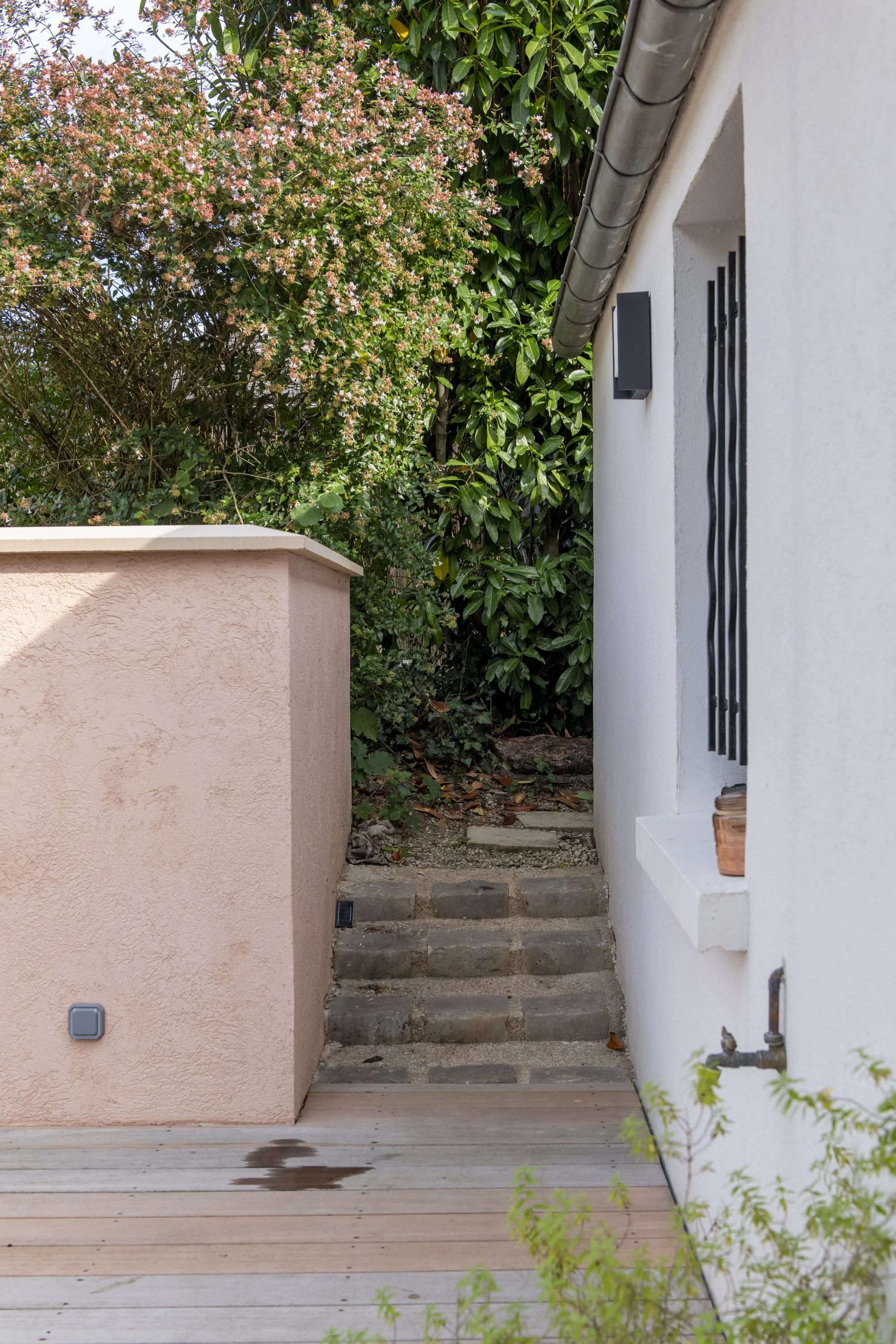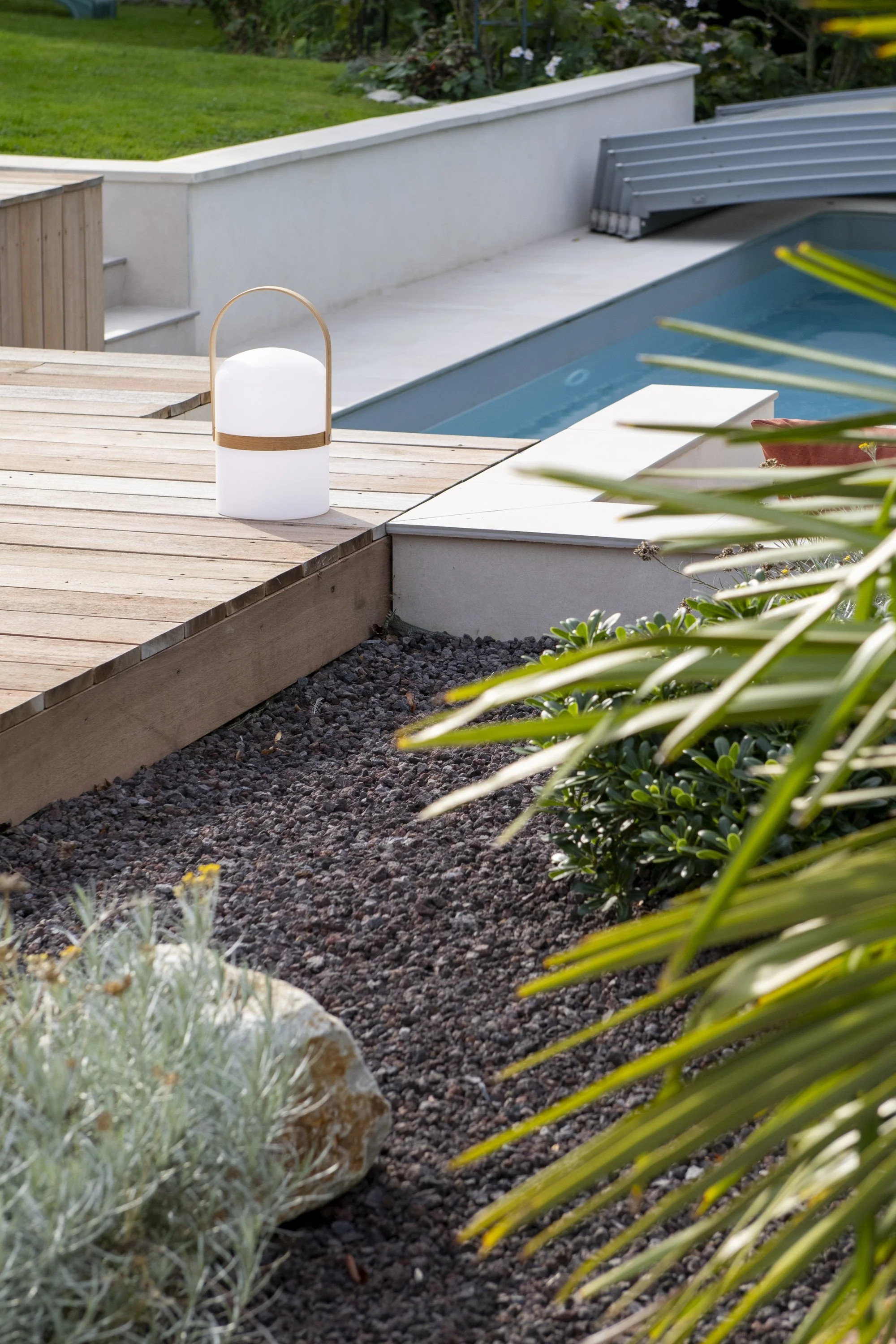 Ce projet de réaménagement paysager concerne le jardin d’une maison avec piscine existante. L’analyse du site a mis en évidence deux problématiques majeures : d’une part, la géométrie des terrasses extérieures ne répondait pas aux usages attendus; d’autre part, les revêtements de sol n’étaient pas adaptés à la nature argileuse du terrain, sujette aux mouvements de retrait-gonflement. Le projet apporte une simplification de l’organisation du jardin en supprimant les courbes et les gradins inadaptés de l’aménagement initial. Il s’appuie désormais sur deux niveaux de terrasses, répondant aux besoins fonctionnels des habitants : un espace repas relié à la cuisine, un espace lounge préservé des regards et une zone solarium attenante à la piscine. La plage de piscine, en contrebas, intègre une méridienne. La véranda existante, peu performante, est entièrement rénovée pour améliorer son isolation et sa luminosité. L’ensemble du réaménagement permet de fluidifier les circulations et d’optimiser les usages extérieurs. La gestion de l’imperméabilisation du sol constitue un autre axe important du projet. Les surfaces végétalisées sont augmentées et repensées pour favoriser l’infiltration des eaux et renforcer l’intimité vis-à-vis du voisinage. Les matériaux ont été choisis en cohérence avec ces objectifs : platelage bois pour les zones de vie principales, grès cérame teinte claire pour la plage de de la piscine, gravier mignonette pour les cheminements secondaires et enduit à la chaux en parements des murets.