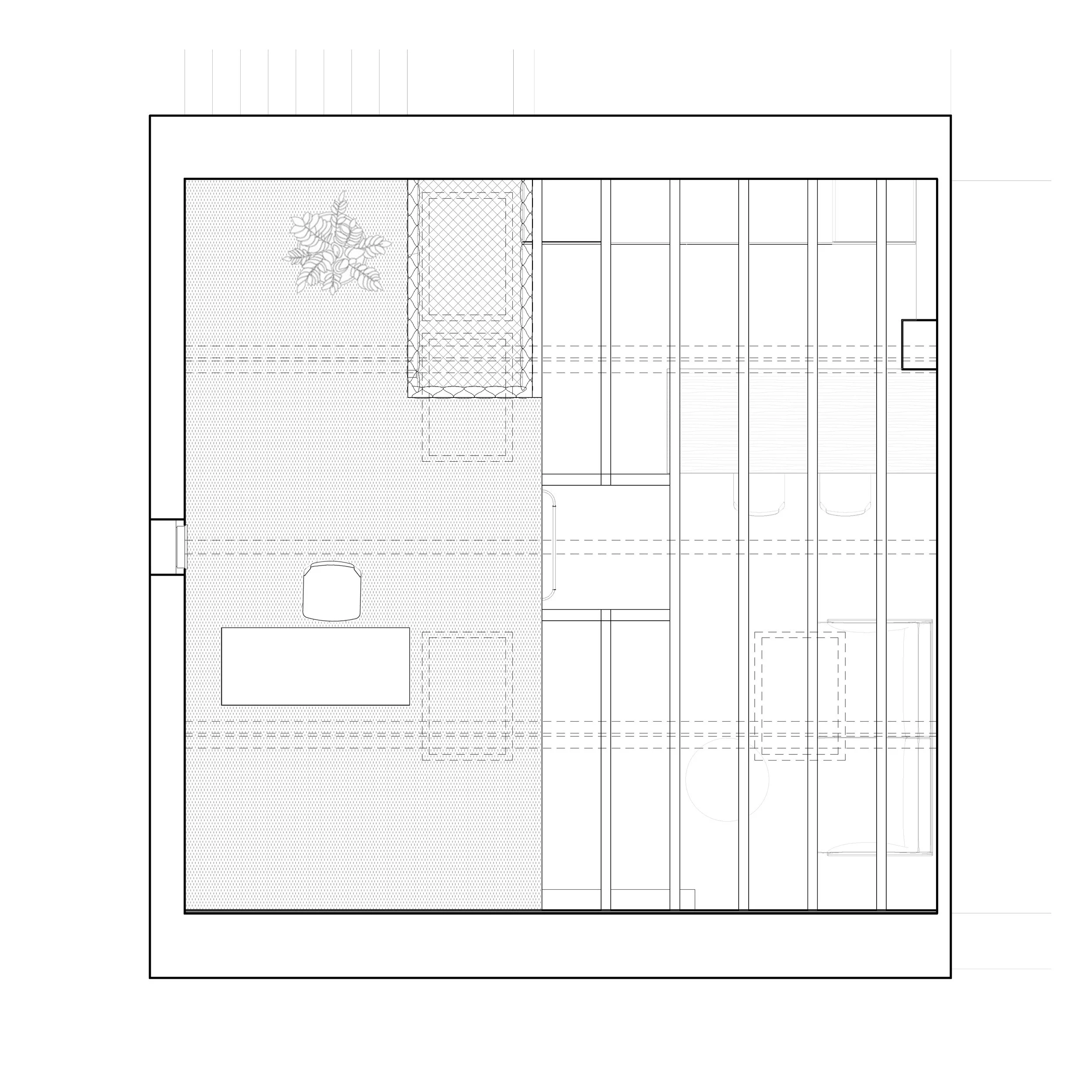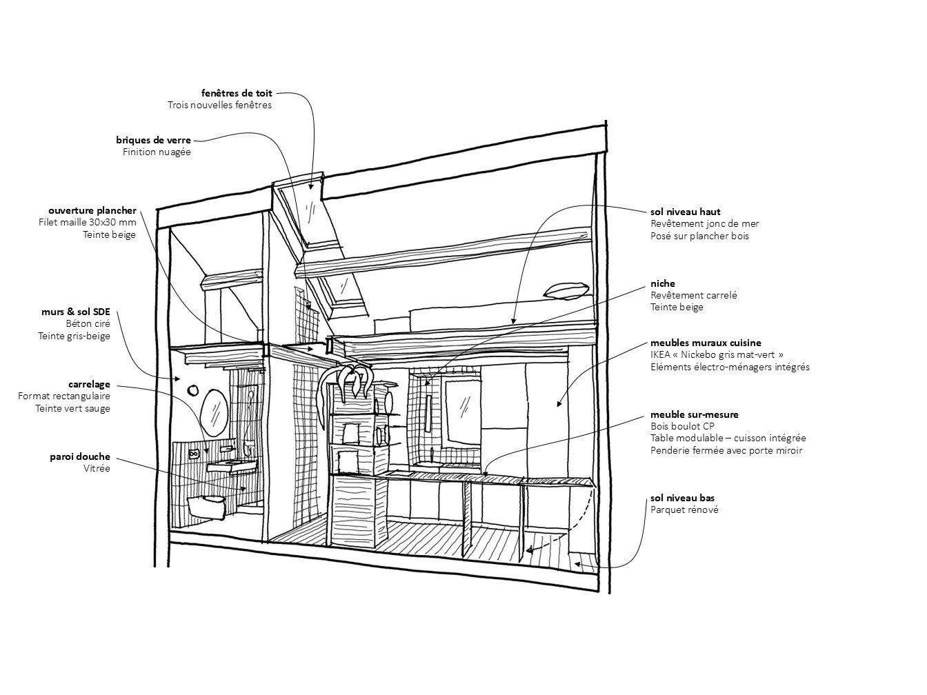 Matériaux Bois CP bouleau, bois restauré, briques restaurées, jonc de mer, béton ciré, filet maille 3x3 cm, grès cérame.