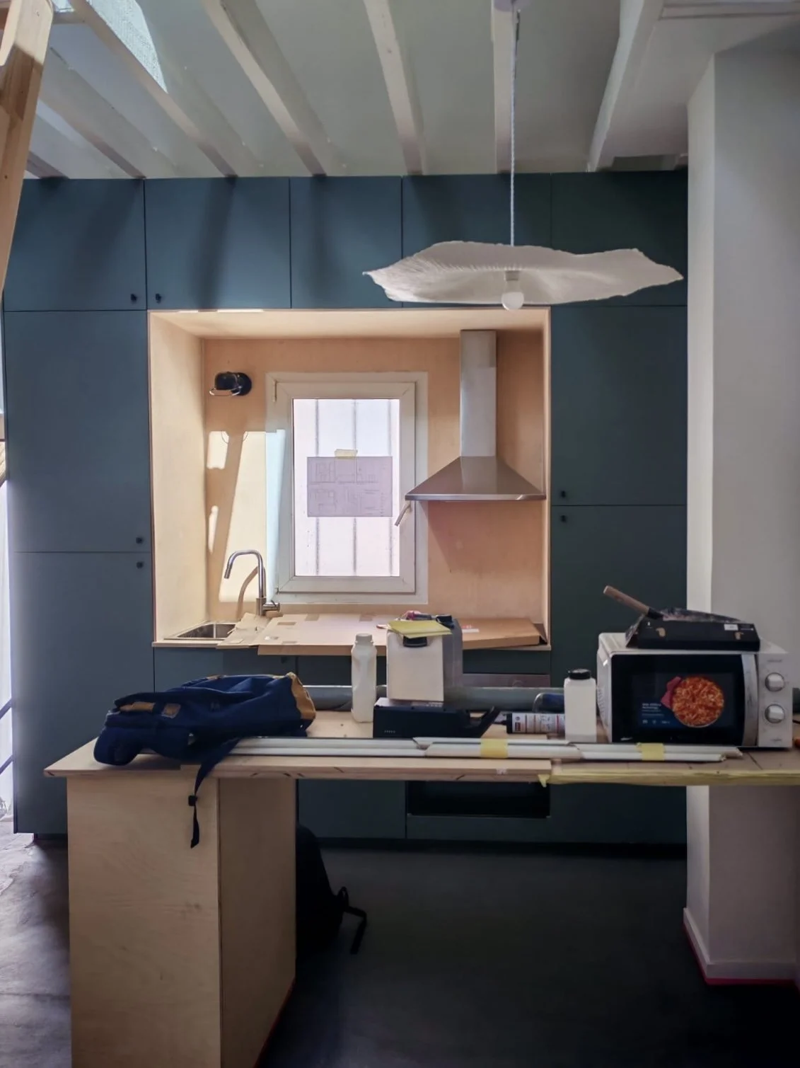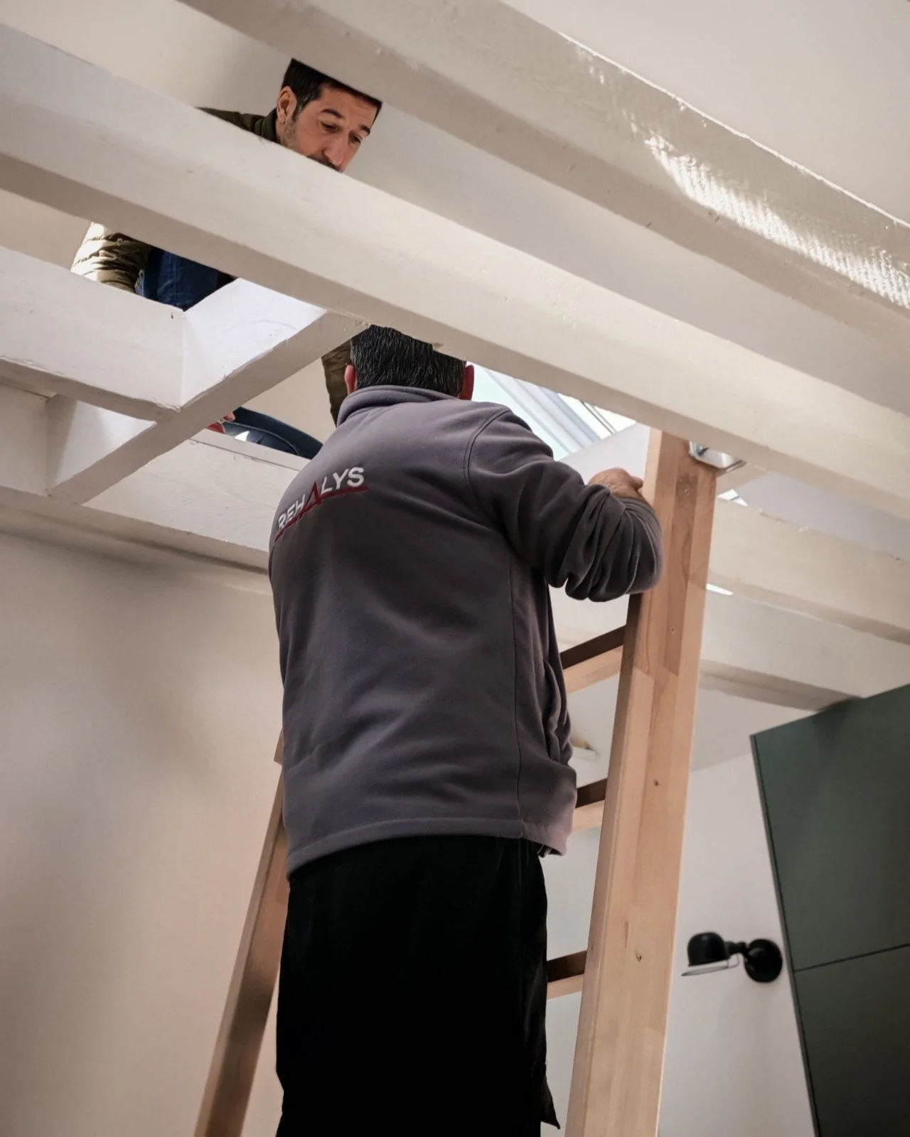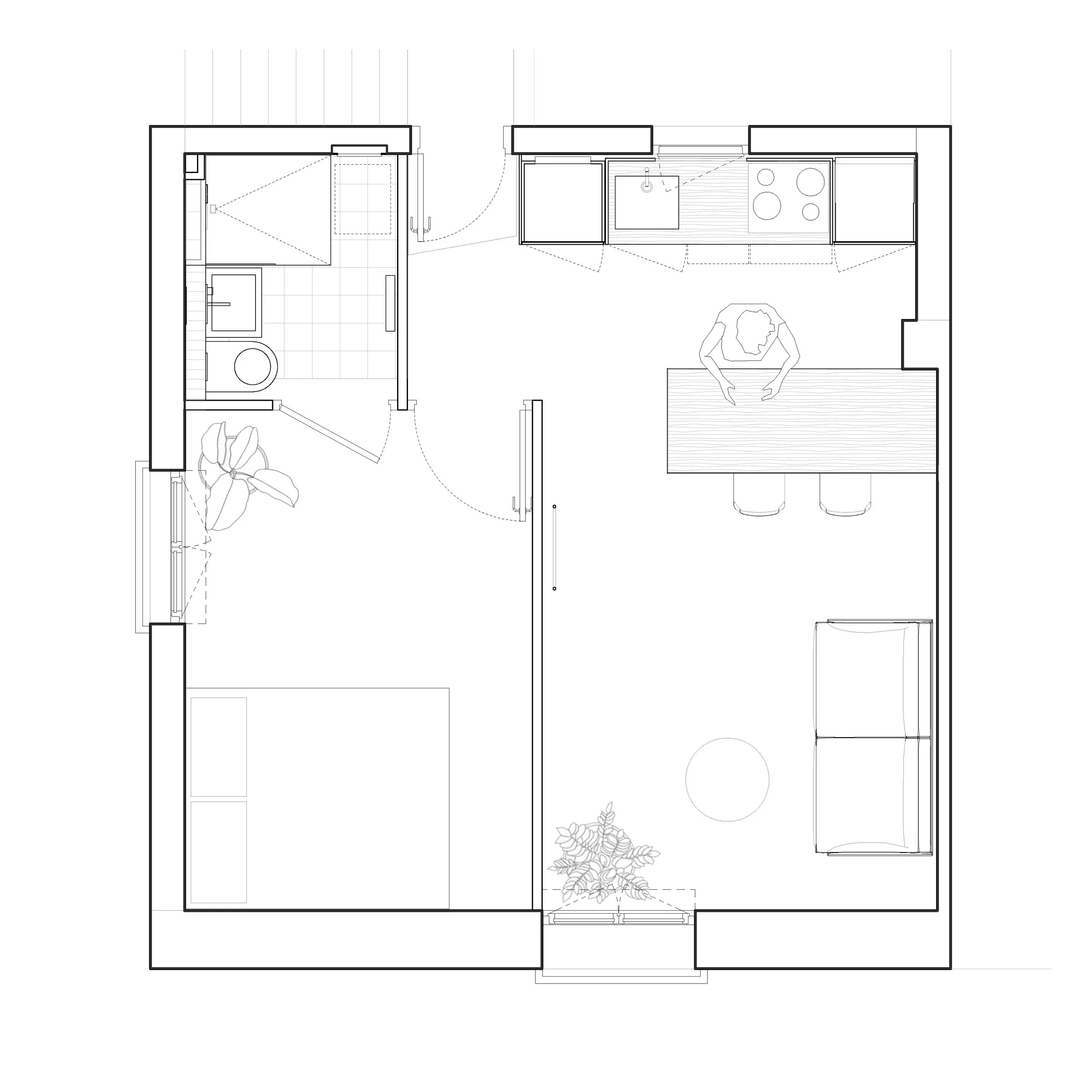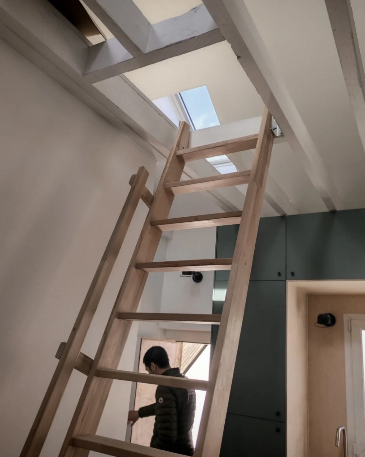 Face à la pression immobilière, les propriétaires de cet appartement montreuillois souhaitaient optimiser chaque mètre carré. Initialement non aménagées, les combles font l’objet d’une rénovation visant l’amélioration des performances de l’enveloppe et l’apport de lumière naturelle : isolation de la toiture, remplacement et ajout de fenêtres de toit. Au départ, le projet visait l'abaissement du plancher haut existant afin d'augmenter la hauteur des combles et de pouvoir y aménager deux chambres. Cette intervention n'ayant pu être réalisée, en raison du refus de la copropriété d'intervenir sur des éléments structurels, nous a conduit à reconsidérer les espaces et a mené des études vers une approche valorisant qualité d’usage et confort. Accessible par une échelle, le volume sous combles ainsi occupé partiellement, deviendra un espace ouvert et multi-usage, laissant apparaître le toit depuis le niveau bas qui accueille la pièce de vie, la chambre et la salle d’eau.