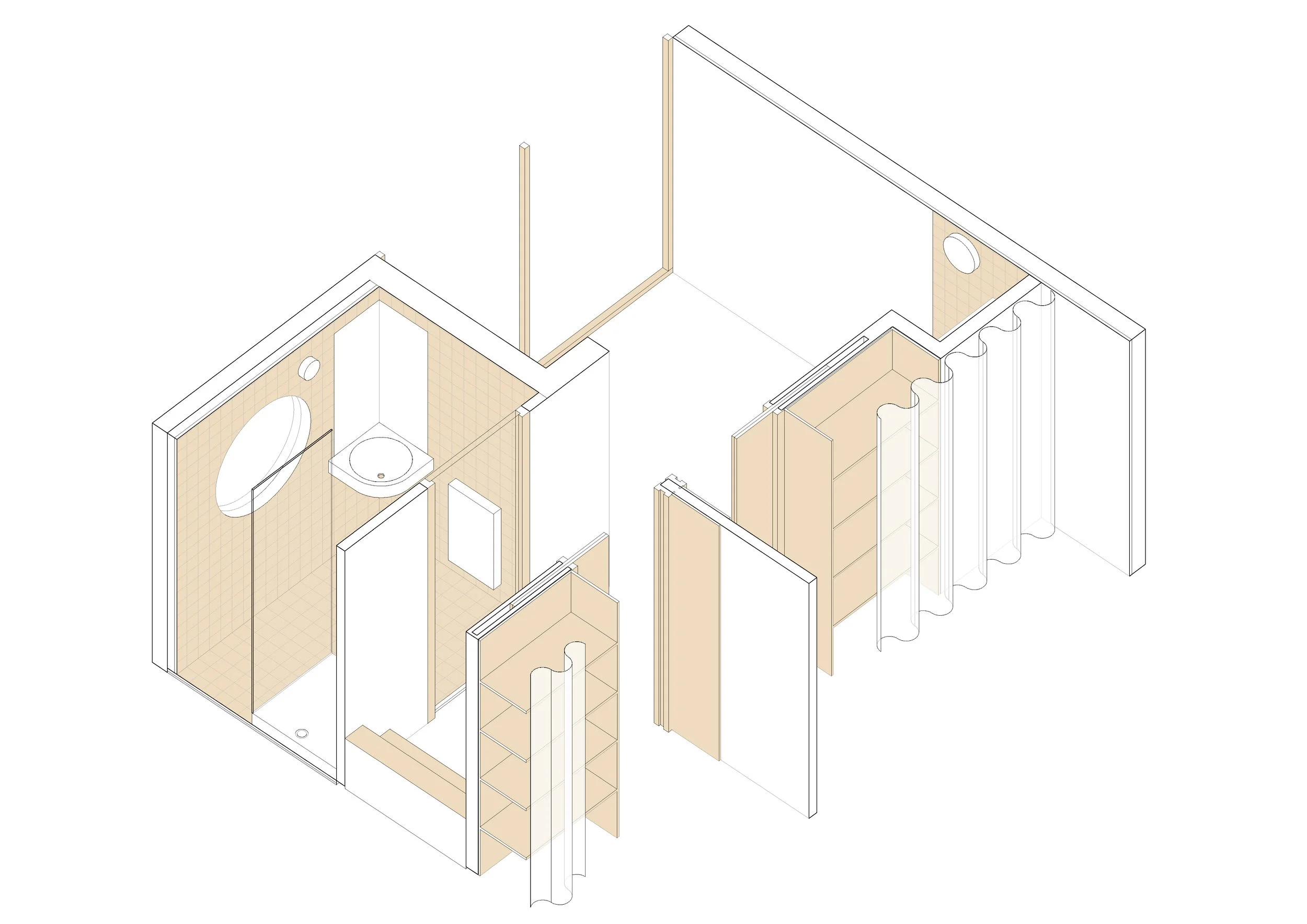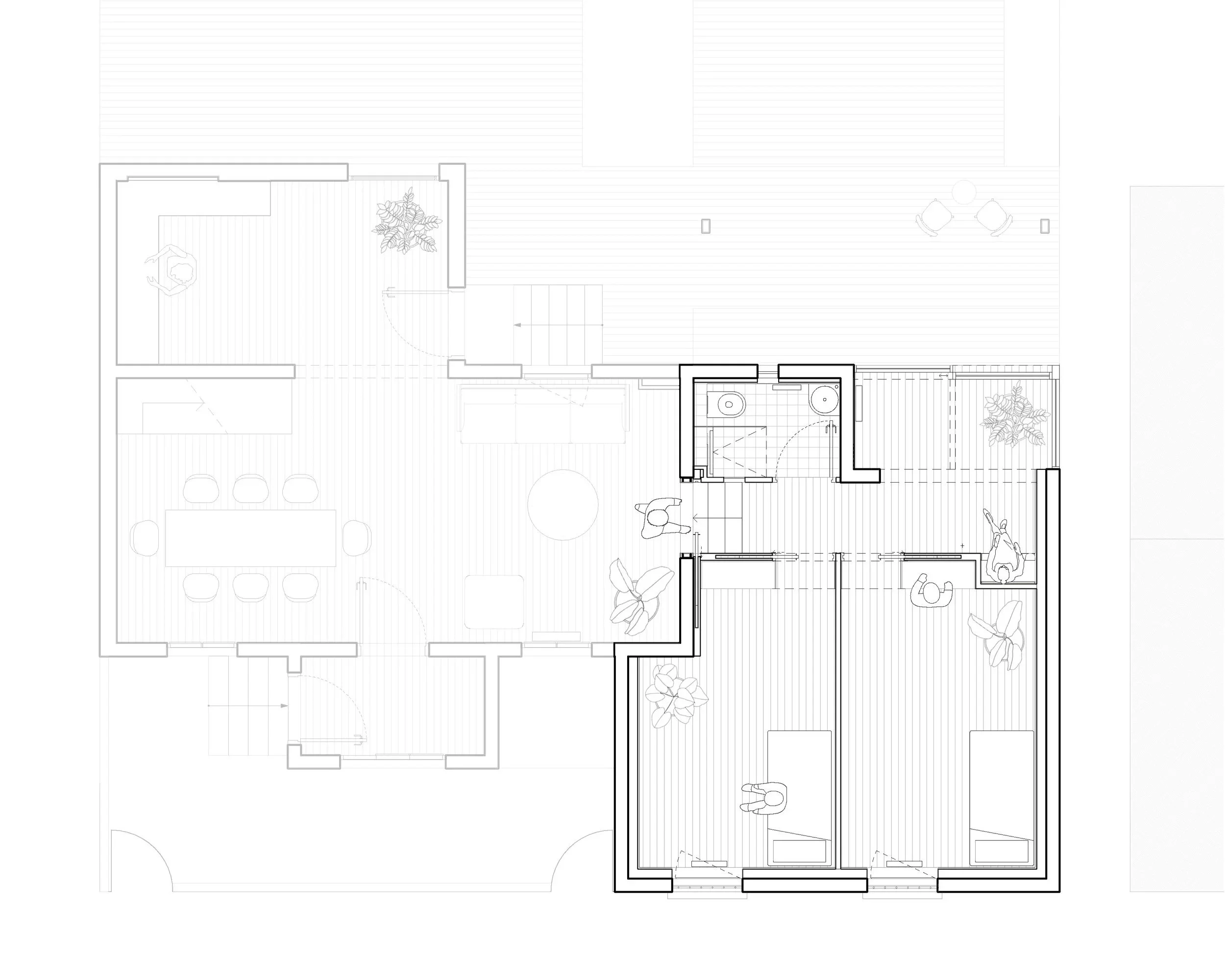 La famille s’agrandit et saisit l’opportunité d’acquérir la petite maison mitoyenne à son habitation actuelle. Le projet consiste à réunir les deux constructions et à rénover la maison nouvellement intégrée afin d’y accueillir les espaces dédiés aux enfants : deux chambres, une salle d’eau et un accès au jardin. Seule l’enveloppe extérieure sera conservée et mise à nu, libérée des éléments superflus, puis renforcée par le remplacement des châssis vitrés et l’apport d’une isolation performante. Une attention particulière y est portée puisqu’on utilisera la ouate de cellulose, isolant issu de produits biosourcés recyclés et inscrivant ainsi le projet dans une démarche responsable et durable. L'aménagement intérieur privilégie le confort d'usage en rendant simple l'accès au jardin depuis la maison actuelle tout en offrant une extension au séjour avec un espace intime et chaleureux, pensé comme un lieu de lecture et de repos.